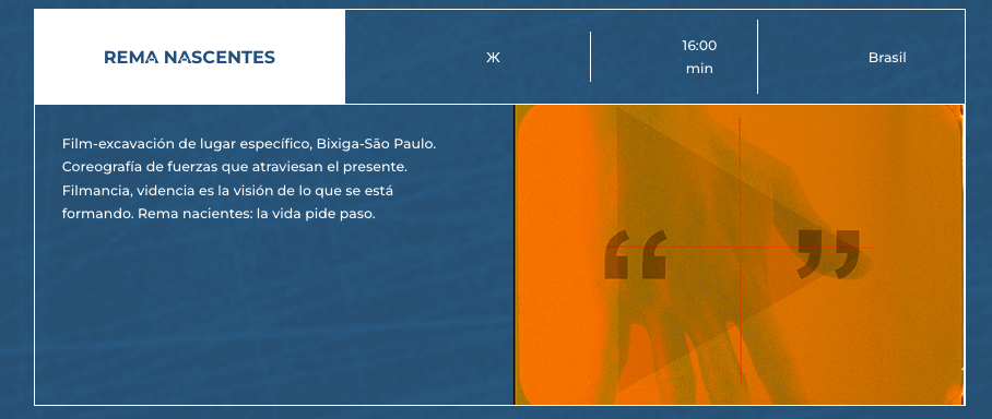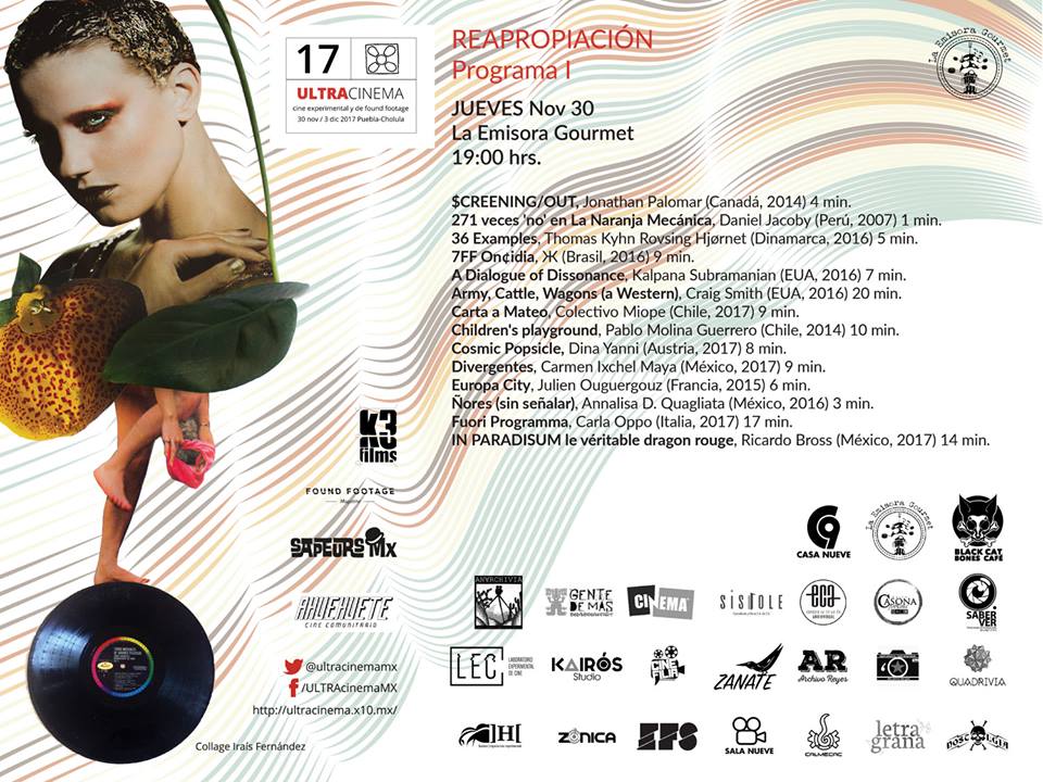 The program – Reapropriación (Reappropriation) curated by Elena Pardo & Ernesto Baca will also show films and videos by Jonathan Palomar, Daniel Jacoby, Thomas Kyhn, Ж, Kalpana Subramanian, Craig Smith, Colectivo Miope, Pablo Molina Guerrero, Dina Yanni, Carmen Ixchel Maya, Jullien Ouguerpouz, Annalisa D. Quagliata, Carla Oppo & Ricardo Bross.