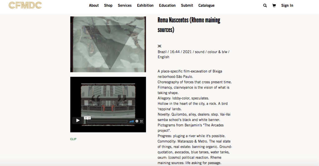 rema nascentes (film, 16 min, 16mm to video, 2021). August (loop) Program City as Character. The Butler Gallery, Evans’Home,John’s Quay, Kilkenny, Ireland. curated by Out of Focus.