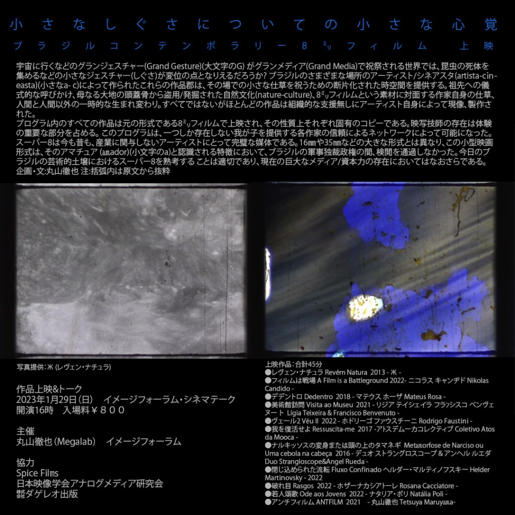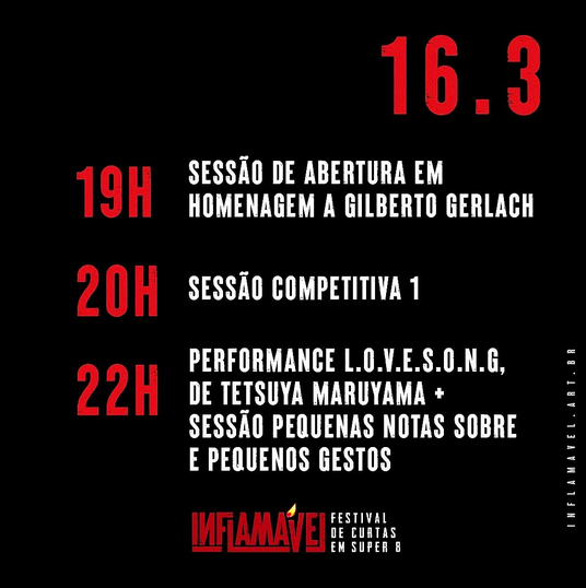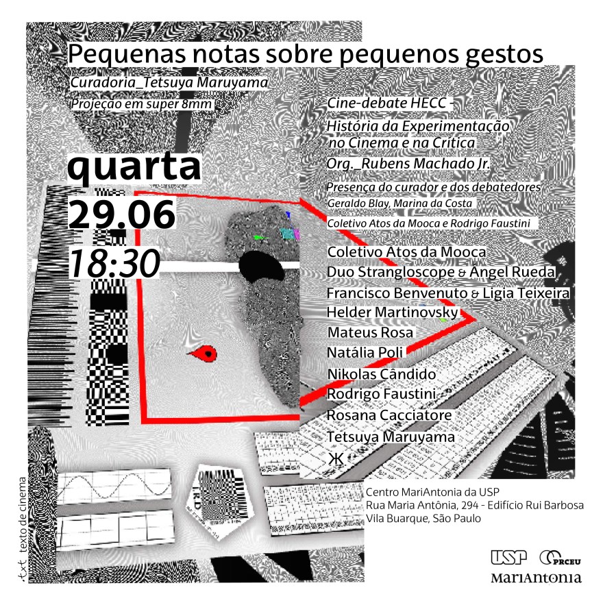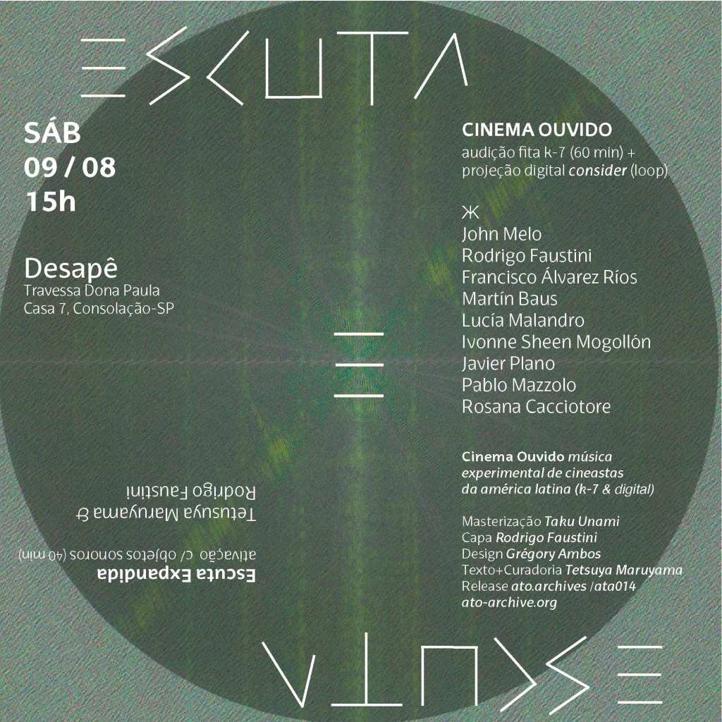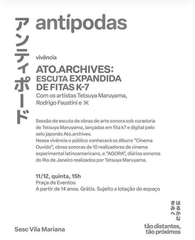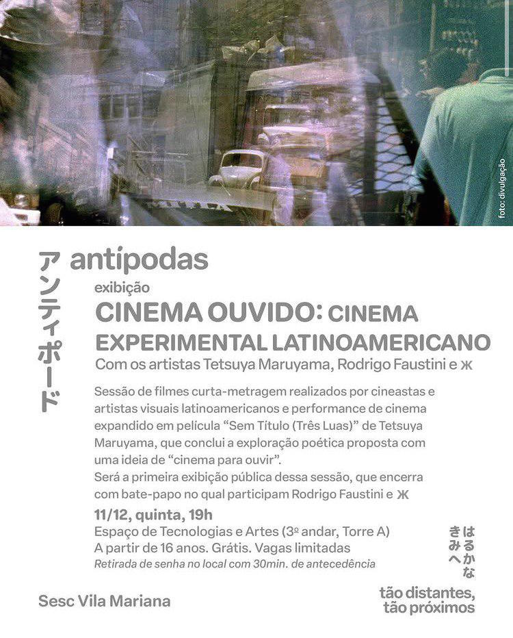 Curadoria Tetsuya Maruyama no contexto mostra Antípodas: tão distantes, tão próximos. Quinta-feira 11 /12, Escuta das 14 ás 17h e sessão de filmes em 16mm às 19h Sesc Vila Mariana, São Paulo. Entrada gratuita com ingressos liberados 1 hora antes da sessão.