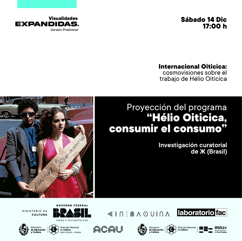 Programa Hélio Oiticica – consumir el consumo. Sábado 14 de Diciembre, 17h en el Museu Nacional de Artes Visuales, Montevideo-Uruguay. Parte de la Internacional Oiticica: cosmovisiones acerca del trabajo de Hélio Oiticica.