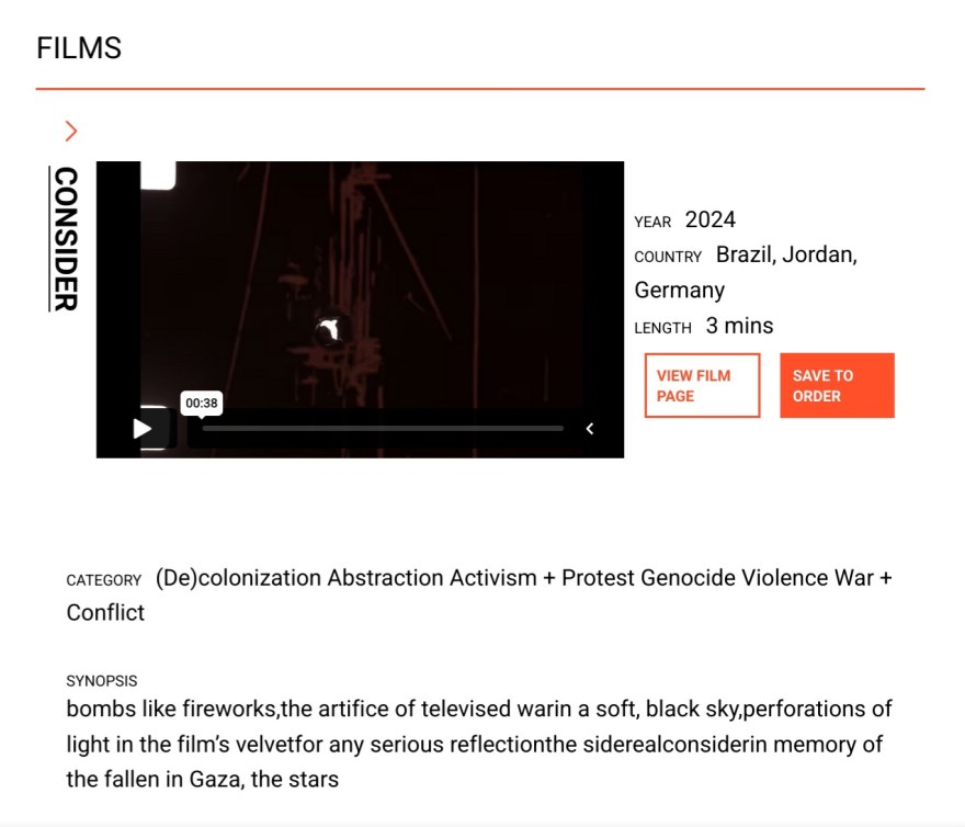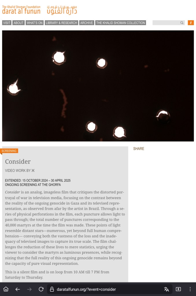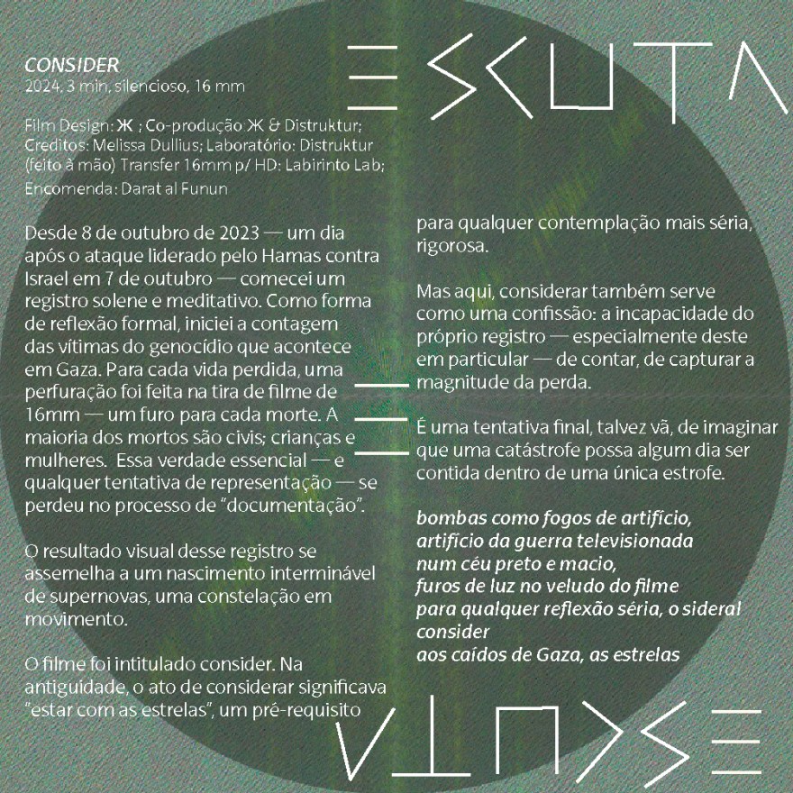 Consider is an analog, imageless film that critiques the distorted portrayal of war in television media, focusing on the contrast between the harsh reality of the Gaza genocide and its televised representation, as observed from afar by the artist in Brazil. Through a series of physical perforations in the film, each puncture allows light to pass through, symbolizing the martyred civilians of Gaza. These points of light resemble distant stars—numerous, yet beyond full human comprehension— conveying both the vastness of the loss and the inadequacy of televised images to capture its true scale. The film challenges the reduction of these lives to mere statistics, urging the viewer to engage with the martyrs as luminous presences, while recognizing that the full reality of this ongoing genocide remains beyond the capacity of visual representation. (Darat al funun text)