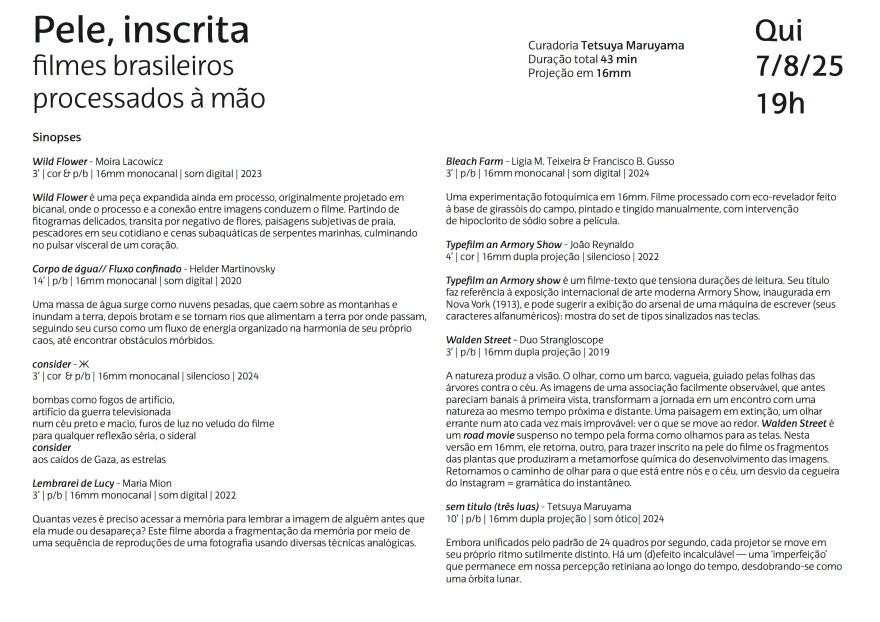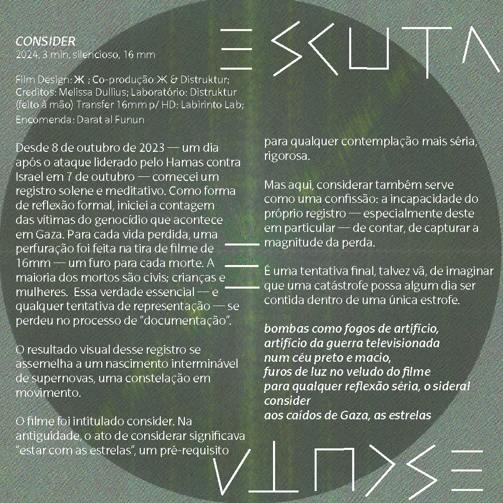 consider, Ж, 2024. X Dobra Festival Internacional de Cinema Experimental.Programa Pele Inscrita- filmes brasileiros contemporâneos processados à mão, programada por Tetsuya Maruyama. Quinta-feira 04/12 às 19h. Centro Cultural do Banco do Brasil (CCBB), Rio de Janeiro.