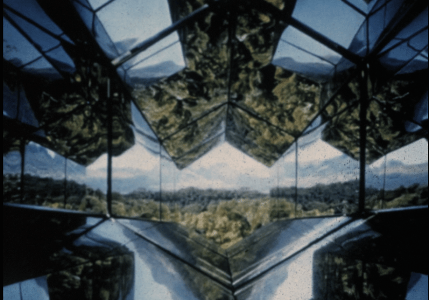 At first we can see a “natural’’ landscape formed by a mountain and green forests surrounded by a blue sky that is transformed into a series of mirages, overlaps and fusions. A landscape that in its kaleidoscopic organization and variations, evokes Adriana’s ”anthropophagic gesture” (thinking with Oswald de Andrade and his Anthropophagous Manifesto). By positioning a 16mm camera inside of Olafur Eliasson’s sculpture “The Viewing Machine” – at the Museo de Arte Contemporânea Instituto Inhotim (Brumadinho, Brazil) – she devours the landscape. She swallowed the Atlantic forest (jungle) and the Cerrado (savanna) of Minas Gerais, its luminosity and its colors. And “extracted” from that space (and from the sculpture itself) a temporality of intensive variability and discontinuous mutation.