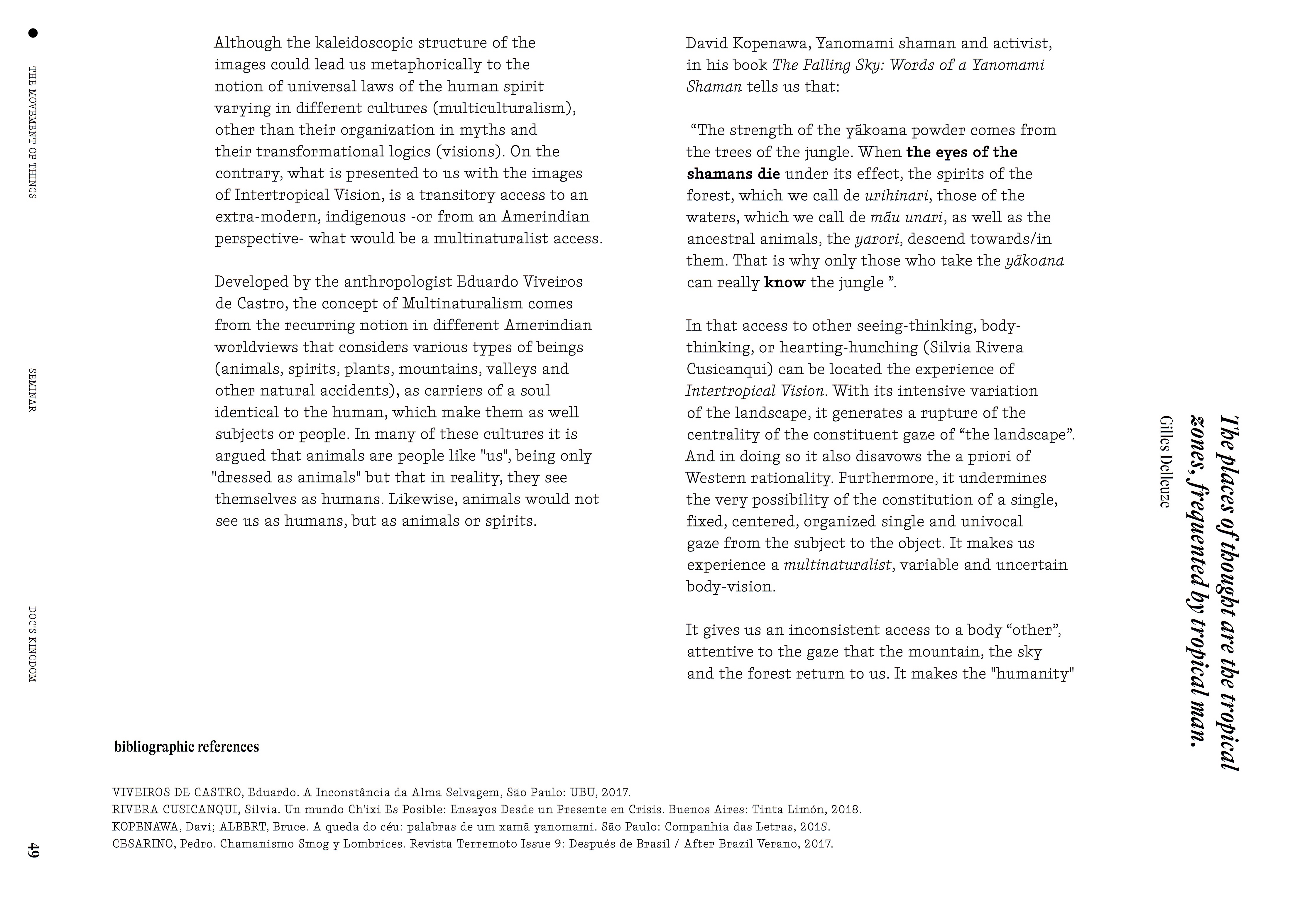 In that access to other seeing-thinking, body-thinking, or hearting-hunching (Silvia Rivera Cusicanqui) can be located the experience of Intertropical Vision. With its intensive variation of the landscape, it generates a rupture of the centrality of the constituent gaze of “the landscape”. And in doing so it also disavows the a priori of Western rationality. Furthermore, it undermines the very possibility of the constitution of a single, fixed, centered, organized single and univocal gaze from the subject to the object. It makes us experience a multinaturalist, variable and uncertain body-vision.