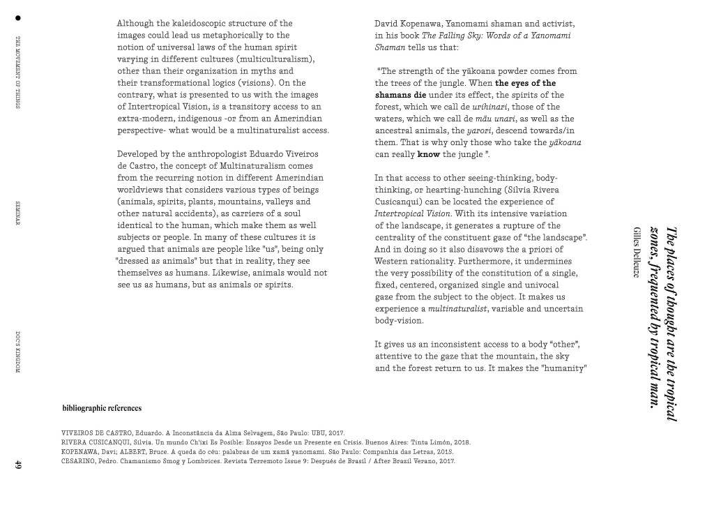 Although the kaleidoscopic structure of the images could lead us metaphorically to the notion of universal laws of the human spirit varying in different cultures (multiculturalism), other than their organization in myths and their transformational logics (visions). On the contrary, what is presented to us with the images of Intertropical Vision, is a transitory access to an extra-modern, indigenous -or from an Amerindian perspective- what would be a multinaturalist access.
