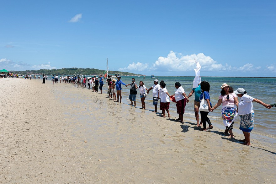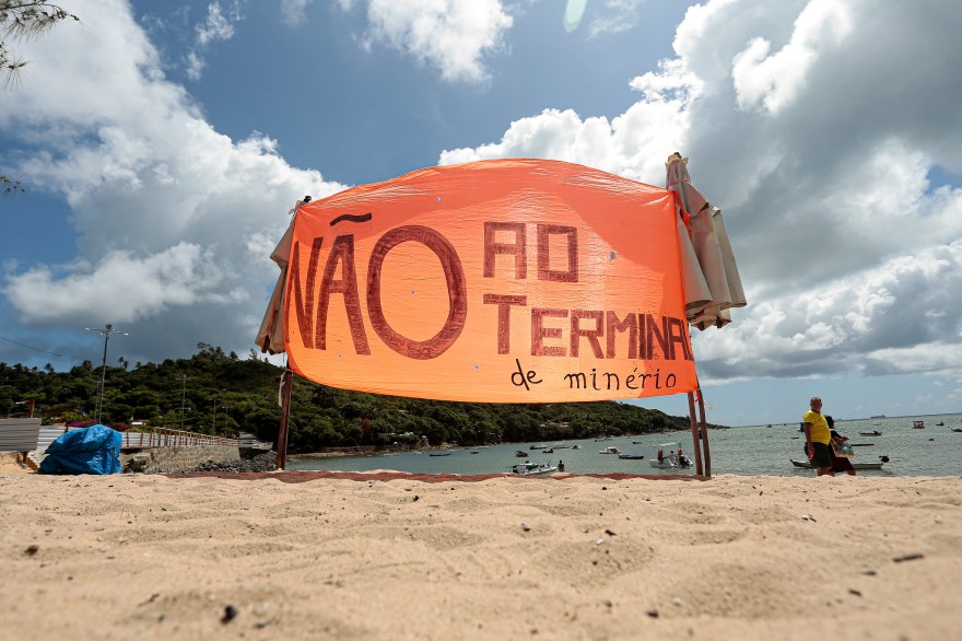 Se anuncia um projeto de instalação de um terminal de minérios em seu território e imediatamente nos juntamos a comunidade local para organizar — como parte da tradicional Festa da Ouriçada — um protesto na forma de abraço à ilha.