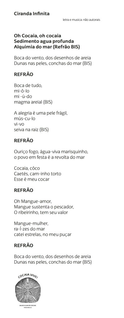 Encontrando semanalmente com marisqueiras, doceiras, pescadoras, cozinheiras, ativistas, biólogas, arquitetas, gente do comércio e varixs outrxs a fim de deixar uma palavra, um verso, um sonho na letra da ciranda composta coletivamente. Ao fim de dois meses de exercício do comum,veio a consistência a melodia e letra da ciranda infinita.